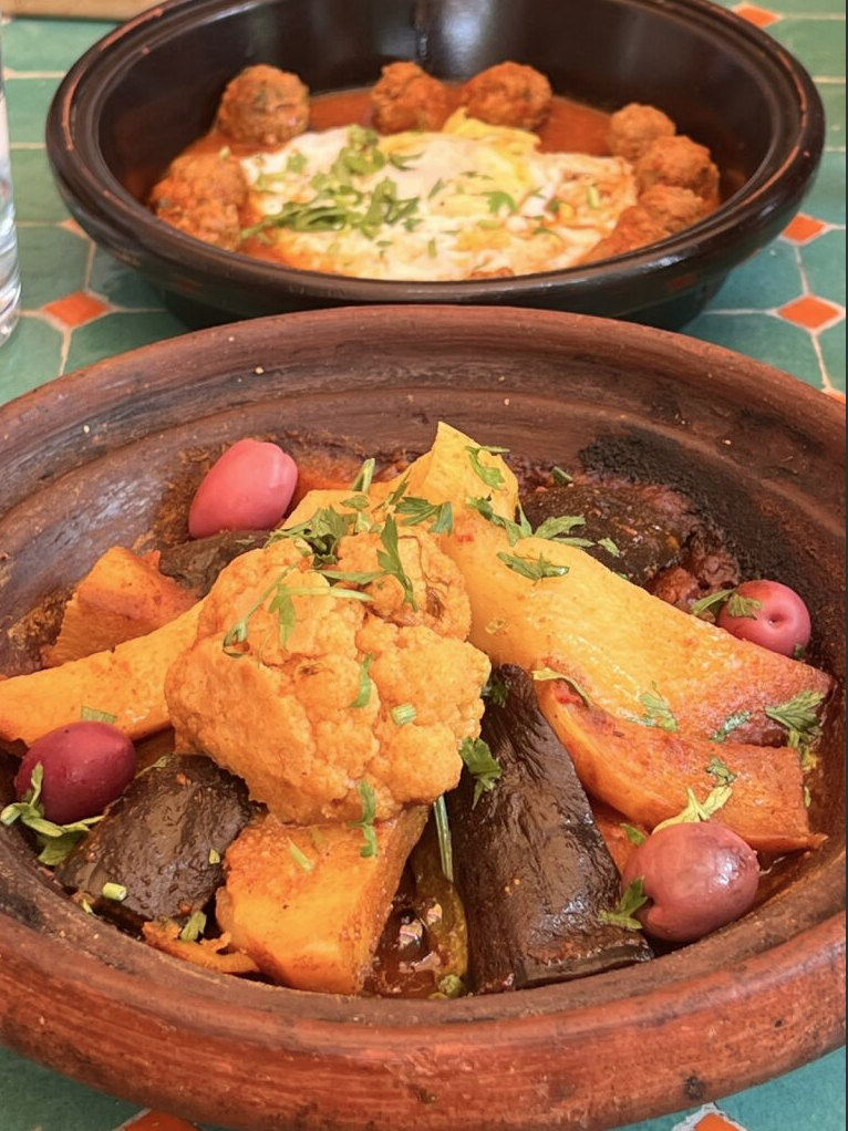 Jag väljer att beställa in en mocktail med det passande namnet Marrakech. Saffransvatten, apelsinjuice, ingefära och mynta är vad jag har i glaset då solen går ner, Atlasbergen i bakgrunden bleknar och stjärnorna kommer upp på himlen i form av en ny kuliss. Att restaurangen heter Noujoum, som är det arabiska ordet för stjärnor känns passande. Maten serveras i form av sharing-konceptet och är både vacker och larvigt smarrig.