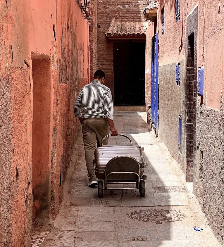 Det är omtumlande, färgstarkt och hektiskt – resan in till Marrakech från flygplatsen tar mindre än en halvtimme. Men resan i tid är inte riktigt vad det handlar om. Motorvägen, en rondell, snart närmar oss Medinan. Vi passerar infarten till det ikoniska lyxhotellet La Mamounia, kommer in på torget där den röda sanden yr, åker genom marknaden och in genom en port där de små gränderna slingrar sig fram. Så stannar vi, och går den sista biten fram till IZZA – en plats för konst och vänner.