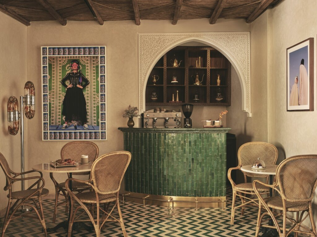 Det tog åtta år att färdigställa IZZA. Ett projekt som handlade om att sammanlänka sju riader här i Medinan. Sedan öppningen den 1 september 2023 finns här 14 unika rum, tre svala innegårdar alla med sin egen vattenkälla: en med en smaragdgrön pool, perfekt för ett uppfriskande dopp, en med fotpool, och en med porlande väggfontän. Därtill leder fem olika trappor till de olika våningarna. IZZA är privatägt av Neon Adventure Ltd, ett Londonbaserat familjeföretag verksamt inom teknologi, fastigheter och filantropi. Initialt var IZZA, ett vad de kallade: ”A house for friends”. Men utrymme och intresset för att skapa något unikt växte fram. Vi tar en av de kakelklädda trapporna upp till takterrassen och restaurang Noujoum där en välkomstmiddag nu väntar.