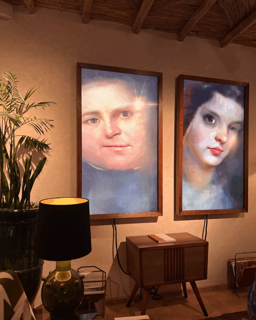 Direkt innanför dörren möts vi av tre stora fotografier från Leila Alaouis serie Les Marocains samt två suggestiva porträtt i ständig förändring Memories of Passersby av Mario Klingemann – de är uppkopplade och programmerade så att de aldrig kommer att bli likadana igen. Sköna soffor, varma kulörer och ett tak i trä. Konsten är en nyckelingrediens här, som vi återkommer till under vår incheckning.