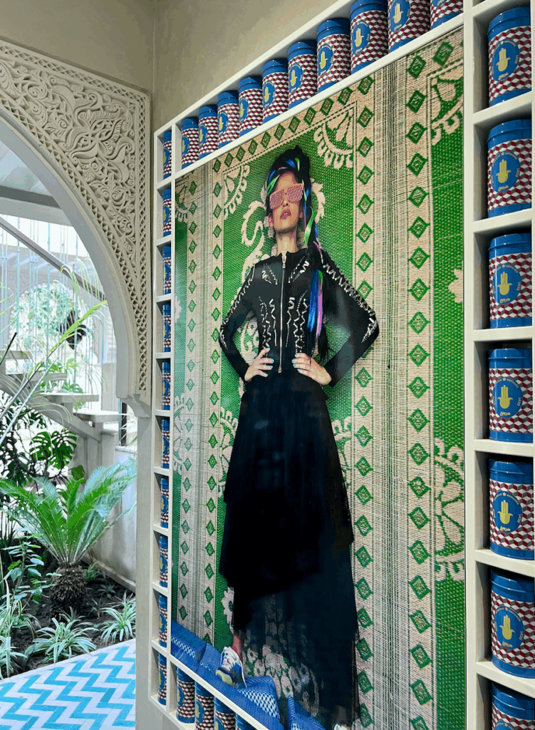 Vi ser AI-kompositioner av Refik Anadol, porträtt av Yatreda, verk av marockanska konstnärer såsom Khadija Jayi och Mouhcine Rahaoui. Vi stannar till vid Hassan Hajjajs stora bild Alo Wala in Black 2015, ett foto och en ram av burkar. Hajjaj beskrivs ibland som Marrakechs Andy Warhol. Har du sett en av hans bilder kommer du fortsätta känna igen hans bildspråk som tenderar till kitsch där geometri möter intressanta och färgstarka karaktärer.