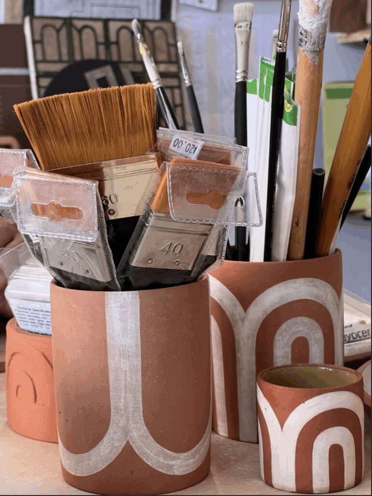 Fåglarna kvittrar utanför. Ett par har redan slagit sig ner i solsängarna intill poolen nedanför min trapp. Frukost på taket och sedan ska vi ägna dagen åt att utforska konst både här och i form av lite egen design. Vi lämnar Medinan och tar taxi till stadsdelen Guéliz där keramikern Fanny Lopez har sin ateljé. Hennes egen fina keramik där stadens portar blivit till krukor och ljuslyktor finns även att köpa på hotellet. Idag ska hon dock låta oss skapa. Vi målar mönster med kritor och färg på vita tallrikar, talar om konstlivet i staden, om möjligheter och utmaningar.