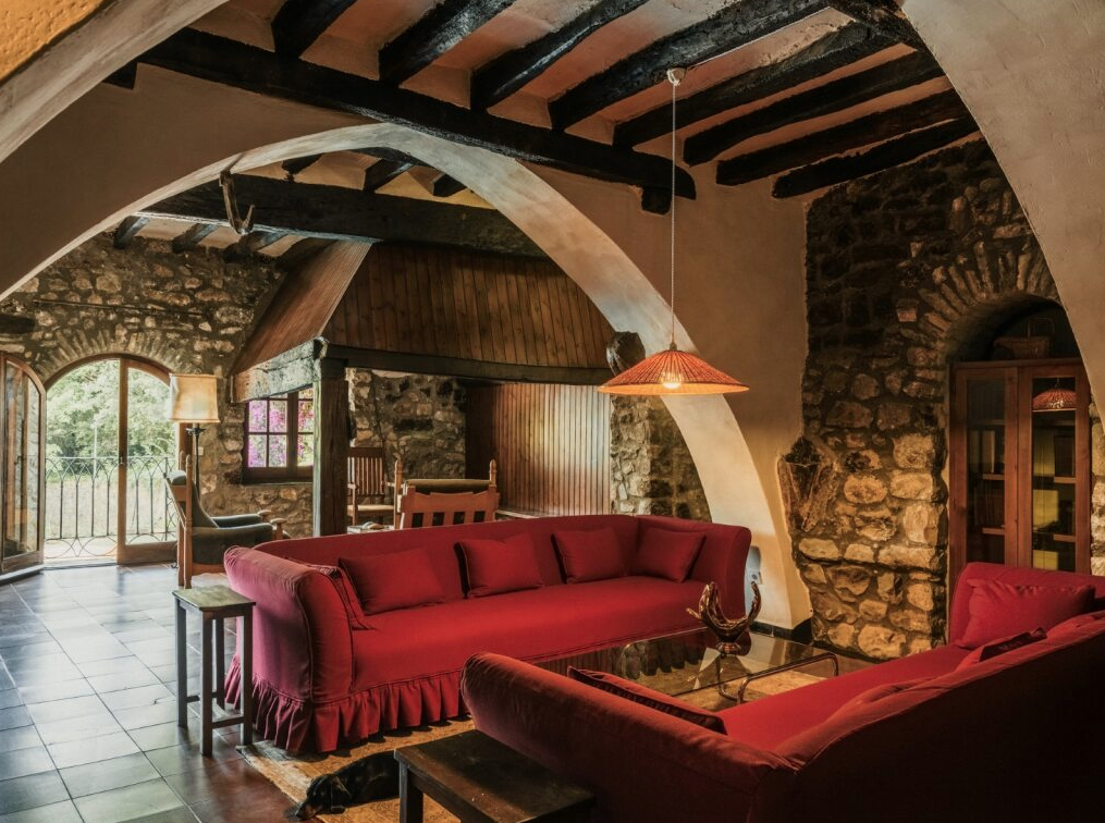 Beth öppnar även dörrarna till några av rummen. Alla helt olika, men med det gemensamma att mycket av den tidigare inredningen har tagits tillvara och uppgraderats. Tillsammans har designern Ariadna Puigdomenech och Gerard Greene väckt nytt liv i den gamla masían. Kalkputsen är påstruken och mjuka terrakottanyanser har målats på väggarna – det gamla möter det nya.