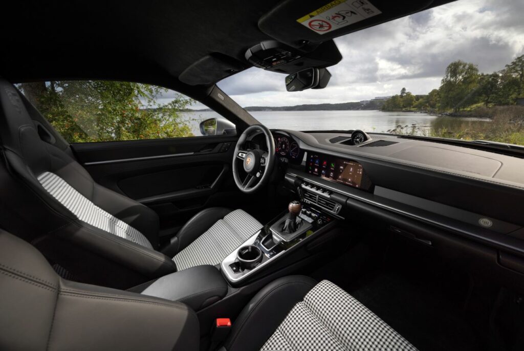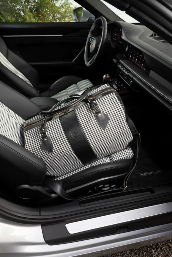 För en weekendresa är Carrera T ett perfekt sällskap. Packningen behöver inte vara stor, men kanske vill man ändå ha något snyggt till middagen. Porsche har därför tagit fram en väskkollektion i matchande design till bilens interiör. Väljer man ett annat material kan även väskorna och förarhandskarna fås i samma tyg. Priset för väskan på bilden ligger på 6 540 kr. Efter några dagar i Carrera T förstår man varför Porsche-ägare ofta ser så nöjda ut. Självklart spelar ekonomi och ordnad tillvaro roll, men lika mycket handlar det om den rena glädjen i att köra en Porsche – oavsett modell. T:et i modellnamnet står för Touring och signalerar att Carrera T erbjuder en mer engagerande körupplevelse än standard911:an. Viktbesparingar gör bilen lättare, motorljudet är mer närvarande och i körlägena Sport och Sport Plus bjuds föraren på ett kraftfullt avgasbludder vid nedväxling. Den manuella växellådan förstärker känslan ytterligare och gör varje växling till en del av upplevelsen. Resultatet är en 911 som känns mer fokuserad och puristisk än många andra versioner, en bil som belönar skicklighet men också kräver koncentration bakom ratten. Carrera T påminner om varför 911 fortfarande är sportbilarnas måttstock.