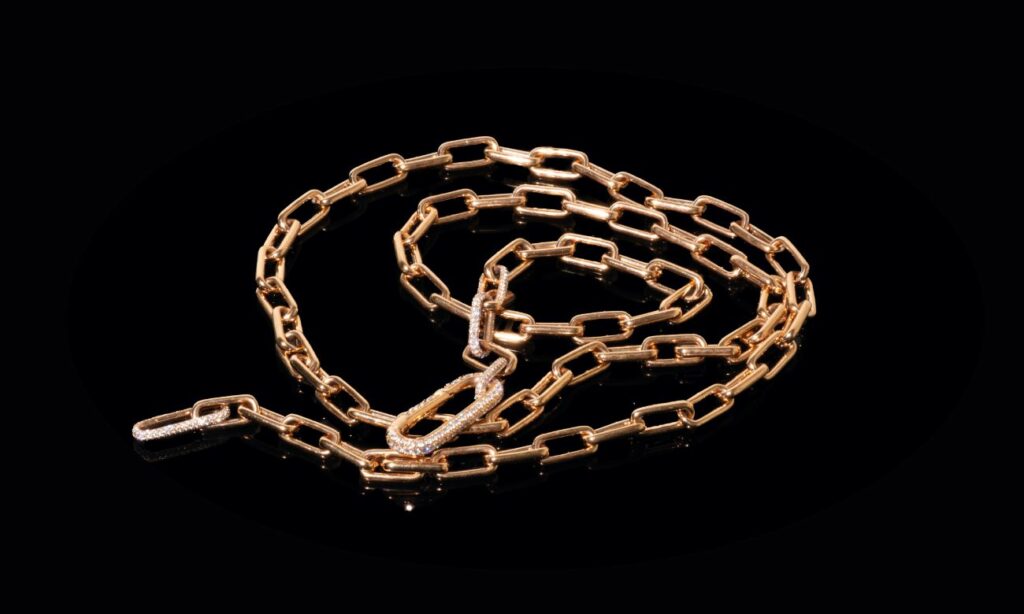 Halsband i 18K guld med två diamantpavérade lås och totalt 462 briljantslipade diamanter. Halsbandet kan delas till armband och skräddarsys efter önskemål. Total carat diamanter: 2,79 ct. Pris 335 000 kr.